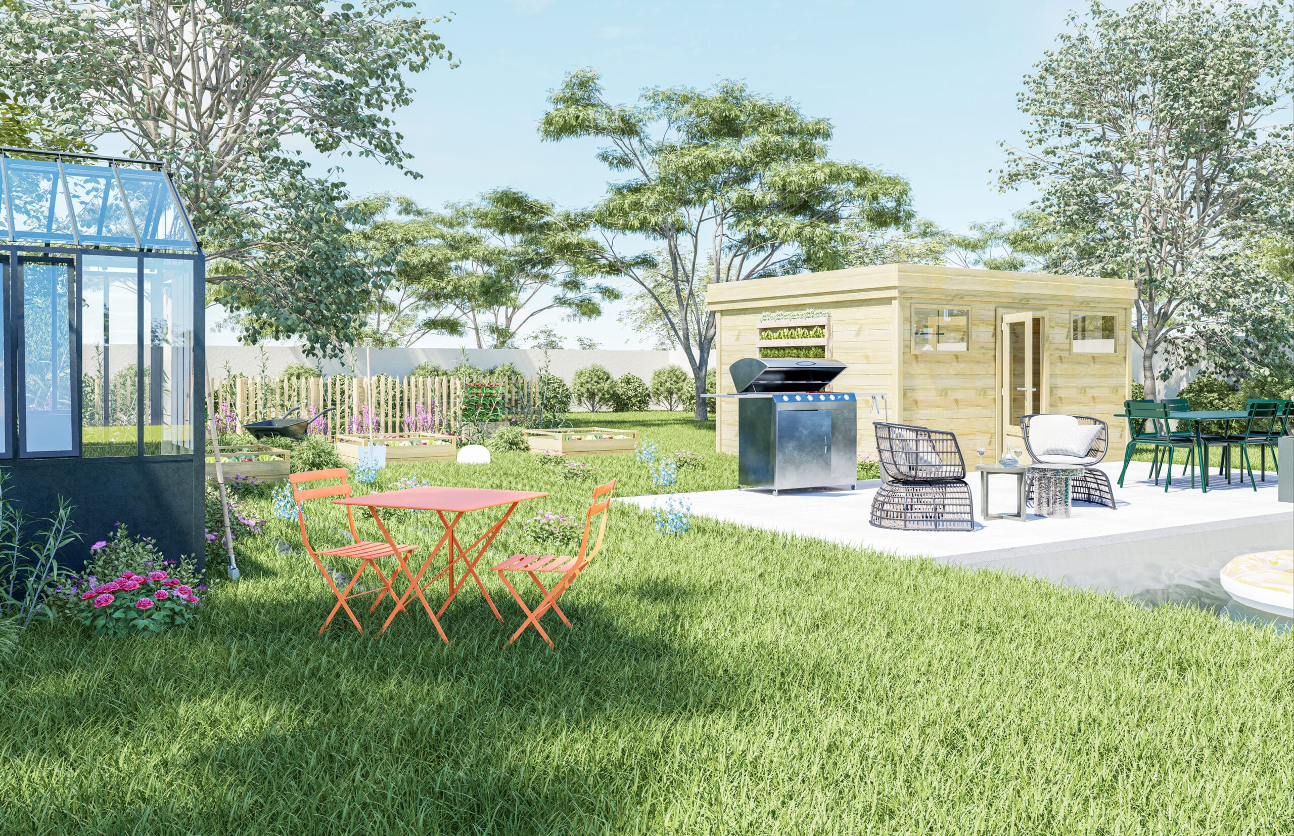 Ne négligez pas le mobilier et la décoration. Pour aménager un coin cuisine confortable et accueillant, choisissez des meubles de jardin résistants aux intempéries et en harmonie avec votre abri. Vous pouvez ajouter des touches de couleur avec des coussins et des accessoires pour personnaliser l’espace.